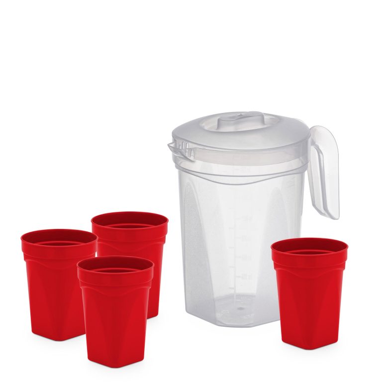 Kit Jogo Jarra Transparente com Tampa e 4 Copos Coloridos de Plástico Plasmont – Prático e Útil para o Dia